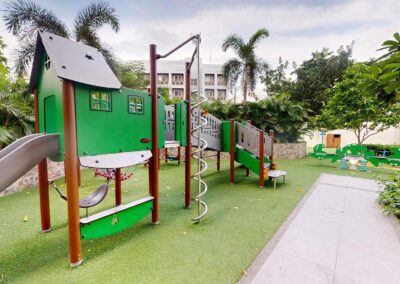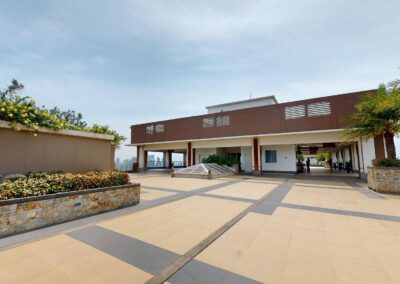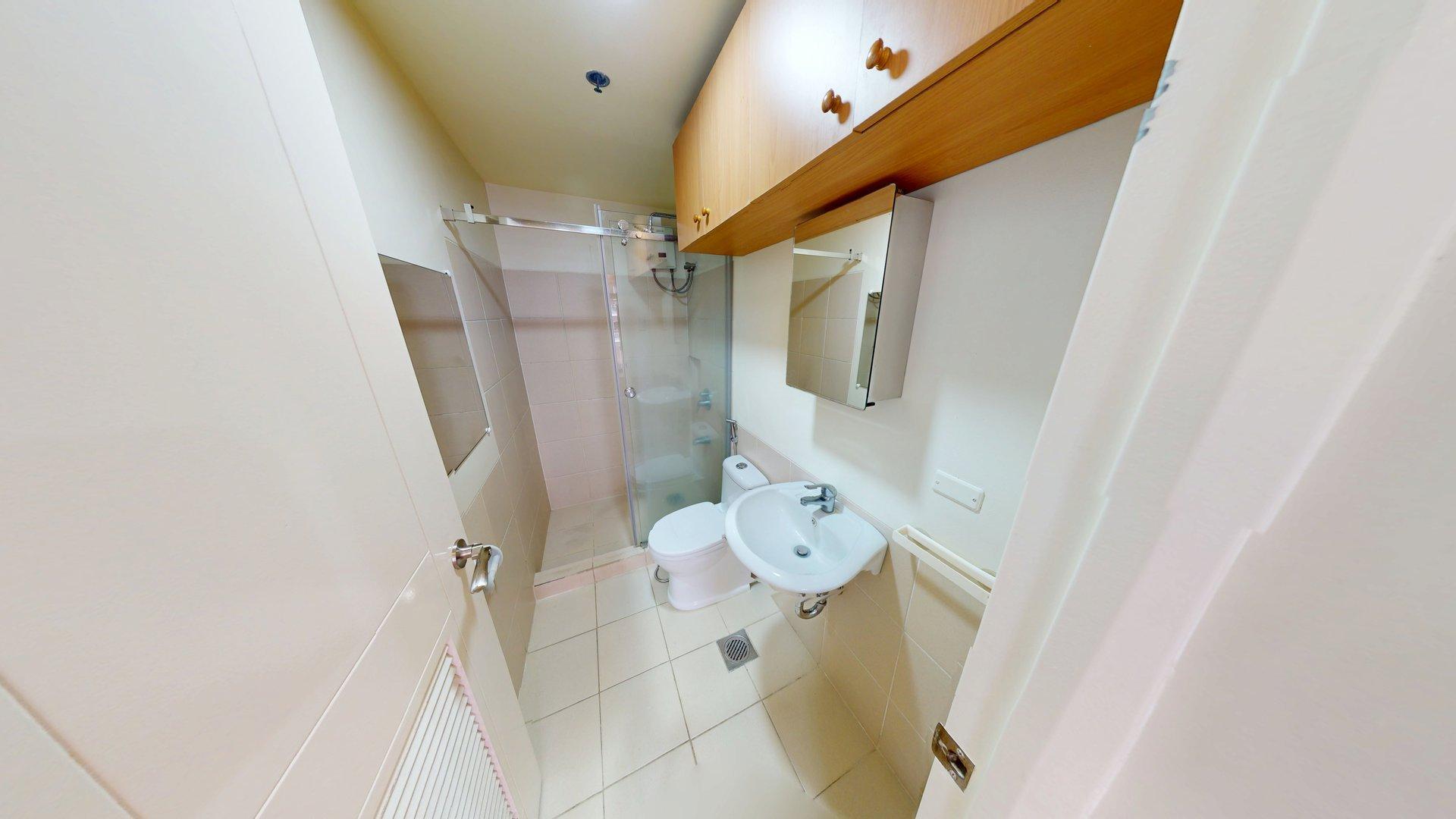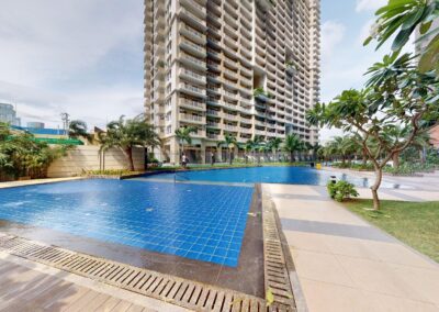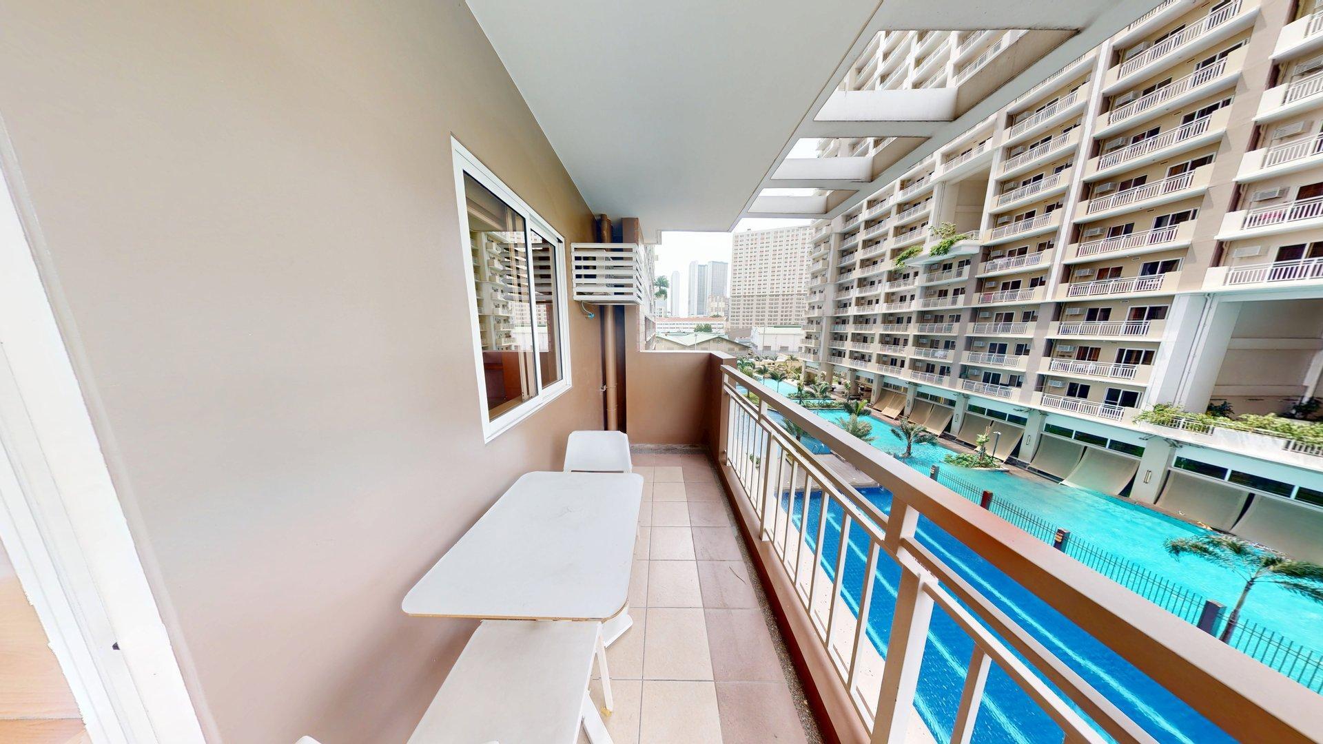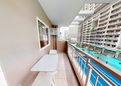 Upon entrance is the kitchen with dual hob cooker, sink, fridge, washing machine and Dining area. Beyond is the Living space offering double sofa, coffee table, and Media cabinet. The shower room offers ample cabinet space. The bedroom benefits from natural light on both sides with double bed, study area, double wardrobes, and 43″ TV. The Balcony spans the Bedroom and Living area with views of Pools and drop off.